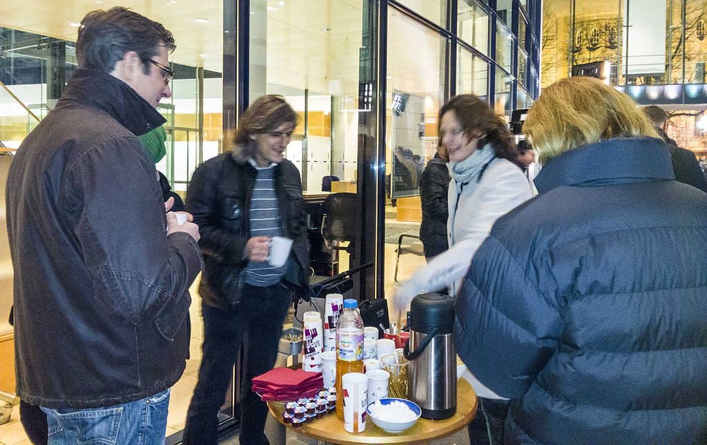 Also haben wir am Abend spontan das Kreisbüro aufgesperrt, die Kaffeemaschine angeworfen und eine mobile Kaffeebar im Eingangsbereich des Willy-Brandt-Hauses aufgebaut. Unsere Staatssekretärin Barbara König, der Kreisvorsitzende Harald Georgii und Daniel Moucha bezogen zum Teil bis 1 Uhr nachts mitten im Medienpulk Stellung. Die Kaffeemaschine gab ihr Bestes und die eilig beschafften Kekse wurden bis auf den letzten Krümel aufgegessen.